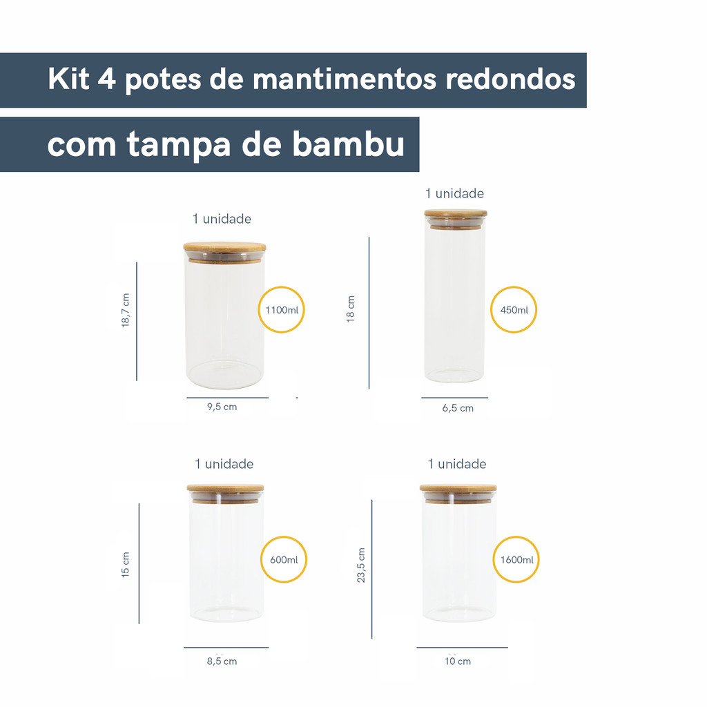 KIT POTE DE VIDRO HERMÉTICO TAMPA BAMBU 450/600/1100/1650ML