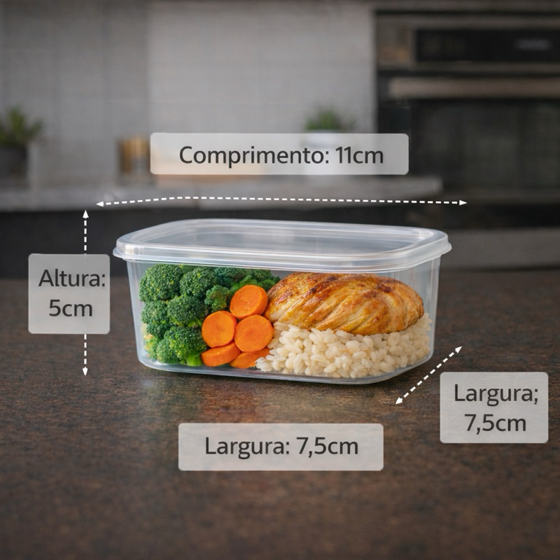 Eleve sua experiência de preparação de refeições com nosso conjunto premium de potes transparentes de 500ml, projetados para atender às necessidades dos entusiastas da vida saudável e fitness. Estes potes são a escolha ideal para armazenar suas refeições cuidadosamente preparadas, mantendo a frescura e a organização. Medidas: Comprimento: 15cm Altura: 5,5cm Largura: 10cm • CARACTERÍSTICAS DO PRODUTO: Material: Plástico bpa free Cor: Transparente Características: Design Transparente: Os potes transparentes permitem visualizar facilmente o conteúdo, facilitando a identificação das refeições e monitorando o nível dos alimentos. Capacidade Ideal: Com capacidade de 500ml cada, esses potes são perfeitos para porções individuais, tornando-os ideais para suas marmitas fitness diárias. Reutilizáveis e Sustentáveis: Fabricados com materiais duráveis e de alta qualidade, esses potes são reutilizáveis, reduzindo o desperdício de embalagens descartáveis e contribuindo para um estilo de vida mais sustentável. Tampa Hermética: Cada pote vem com uma tampa hermética que mantém os alimentos frescos por mais tempo, preservando seu sabor e nutrientes. Organização Prática: O conjunto de potes oferece uma solução conveniente para a organização de suas refeições semanais, facilitando o planejamento e o acesso rápido aos alimentos. Versatilidade: Além de serem ideais para marmitas fitness, esses potes são excelentes para armazenar uma variedade de alimentos, como saladas, sobremesas, lanches e muito mais. Faça da sua jornada fitness uma experiência mais eficiente e organizada com nossos potes transparentes reutilizáveis de 500ml. Invista na qualidade e praticidade para alcançar seus objetivos de saúde e bem-estar.