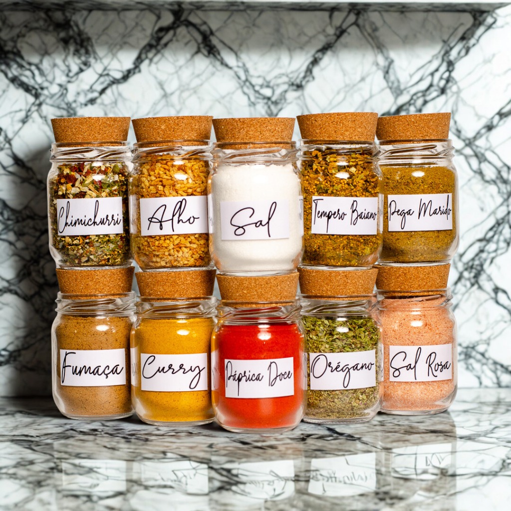 Kit Potes de Tempero 200ml - Porta Temperos - Cartela de Temperos com 42 Adesivos Opcionais