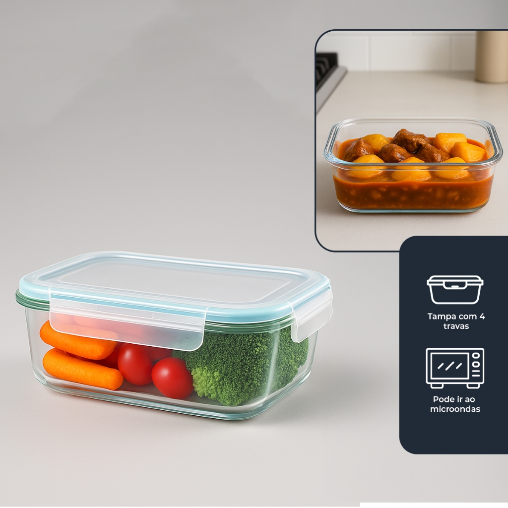 Pote de Vidro Hermético 640ml: Organização e Frescor com Estilo! Mantenha seus alimentos frescos e saborosos por mais tempo com nosso Pote de Vidro Hermético de 640ml, equipado com uma tampa de 4 travas para um selamento perfeito. Diga adeus a vazamentos e contaminações! Benefícios e Vantagens •Frescor Prolongado •Economia e Menos Desperdício: Com a tampa hermética de 4 travas, seus alimentos permanecem frescos por mais tempo, reduzindo o desperdício e economizando dinheiro. Material Premium •Durabilidade e Resistência: Feito de vidro borossilicato super resistente, suporta uso diário e temperaturas de até 300°C (sem a tampa). Versatilidade •Uso Diversificado: Ideal para armazenar refeições caseiras, lanches e pequenas porções. Pode ser usado no freezer, micro-ondas, forno (sem a tampa) e lava-louças. Ecológico e Seguro •Sem Químicos Nocivos: Livre de BPA e outras substâncias prejudiciais, é seguro para sua família e para o meio ambiente. Design Elegante • Estilo e Funcionalidade: Além de eficiente, adiciona um toque de elegância à sua cozinha ou despensa. Ficha Técnica • Material: Vidro Borossilicato • Capacidade: 640ml • Dimensões: 7 x 12 x 17 cm • Tampa: Hermética com 4 travas • Resistência: Até 300°C (sem a tampa) • Uso: Freezer, micro-ondas e lava-louças • Segurança: Livre de BPA • Versatilidade: Ideal como marmita Conteúdo da Embalagem • Potes de Vidro Hermético de 640ml Instruções de Uso e Cuidados • Primeiro Uso: Lave com água morna e sabão neutro. • Selamento: Encaixe corretamente a tampa para garantir a vedação. • Micro-ondas: Retire a tampa antes de aquecer. • Manutenção: Lave à mão ou na lava-louças; evite utensílios abrasivos e choques térmicos. *EVITE MUDANÇAS SUBTIDAS DE TEMPERATURA, AO TIRAR DO CONGELADOR ESPERAR O PRODUTO DESCONGELAR PARA LEVAR AO MICROONDAS* Conteúdo da Embalagem • Potes de Vidro Hermético de 370ml Instruções de Uso e Cuidados • Primeiro Uso: Lave com água morna e sabão neutro. • Selamento: Encaixe corretamente a tampa para garantir a vedação. • Micro-ondas: Retire a tampa antes de aquecer. • Manutenção: Lave à mão ou na lava-louças; evite utensílios abrasivos e choques térmicos. *EVITE MUDANÇAS SUBTIDAS DE TEMPERATURA, AO TIRAR DO CONGELADOR ESPERAR O PRODUTO DESCONGELAR PARA LEVAR AO MICROONDAS