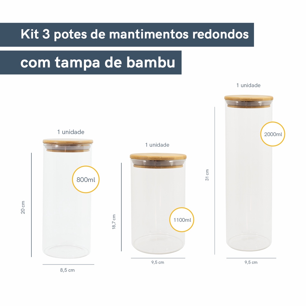 Kit potes de vidro herméticos 2000/1100/800ml 3 pçs - Oikos