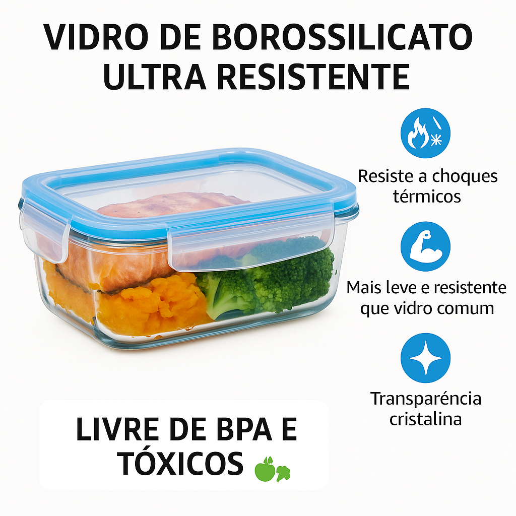 Kit Potes Herméticos Alimentos Marmita Fitness vidro Retangular 640ml / 370ml - GP Home