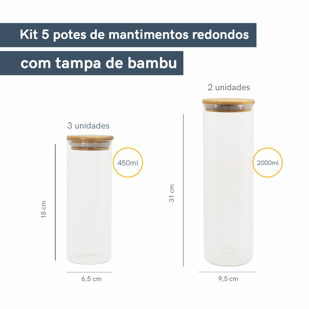 KIT POTES HERMETICOS VIDRO CIRCULAR BAMBU 2000/450ML - 5PÇS