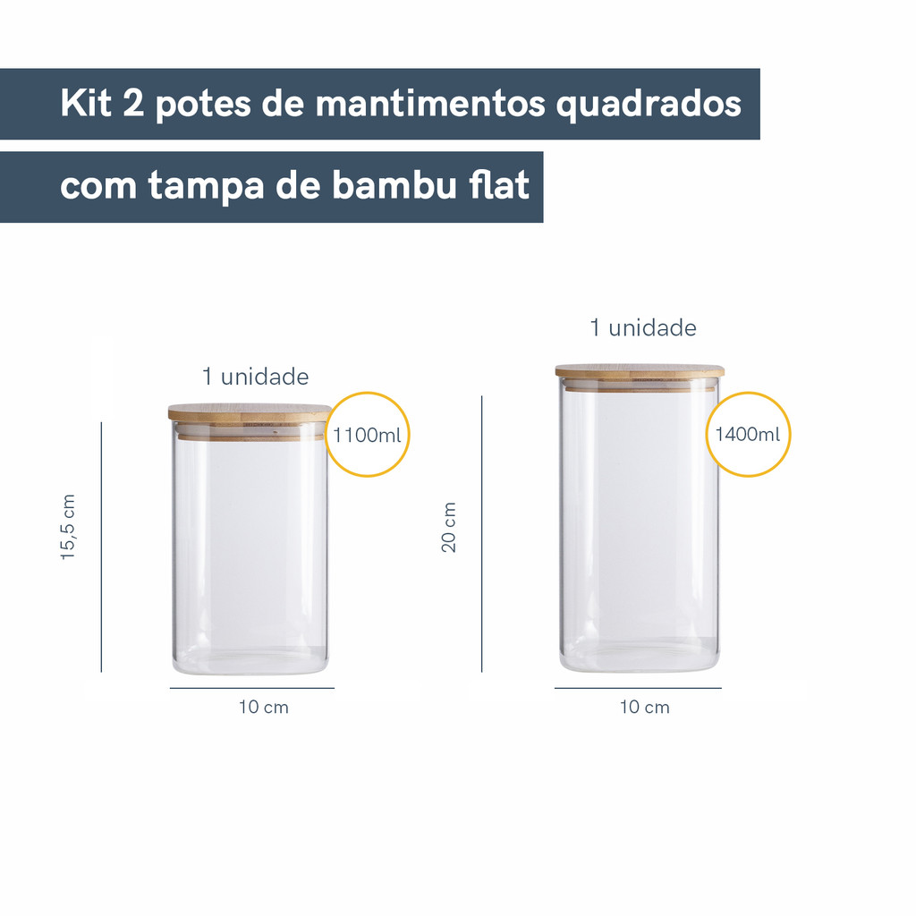 "Esse é o conjunto de potes de mantimentos quadrado flat com tampa de bambu da OIKOS. Seu formato quadrado ajuda a aproveitar melhor o espaço - ele encaixa direitinho no canto do armário. Tampa flat: uma tampa de bambu retinha, fácil de limpar e que fica uma graça na cozinha ;). E não julgue pelas aparências, ele não é só um potinho bonito: com a combinação da vedação de silicone e o bambu antibacteriano, esse pote se torna um verdadeiro mestre na conservação de alimentos! E não é só de comida que vive esse pote: pisca-pisca, pregadores de roupa, decoração de Natal, nozes, flores secas, fios e o que mais você quiser guardar - isso que é versatilidade. Esse conjunto contém 2 peças: 1 unidade - POTE DE MANTIMENTOS QUADRADO FLAT 1100ML TAMPA BAMBU – OIKOS Comprimento: 10 cm / Largura: 10 cm / Altura: 15,5 cm 1 unidade - POTE DE MANTIMENTOS QUADRADO FLAT 1400ML TAMPA BAMBU - OIKOS Comprimento: 10 cm / Largura: 10 cm / Altura: 20 cm"