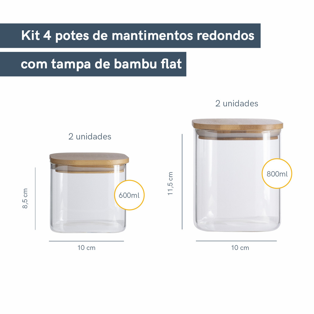 Kit Potes Hermeticos Vidro Quad Flat Bambu 800/600ml - 4 pçs Oikos