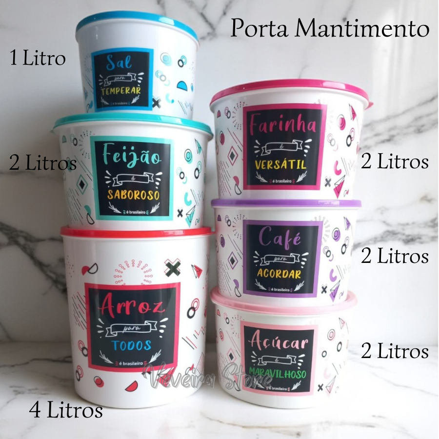 Inspiração da Tupperware! Decoração aplicada diretamente no pote, não é adesivo! Resistente à lavagem, a estampa permanece intacta mesmo após o uso frequente. Escolha seu kit favorito: 6 Portas Mantimentos 1 Pote Arroz 4 Litros 1 Pote Feijão 2 Litros 1 Pote Açúcar 2 Litros 1 Pote Farinha 2 Litros 1 Pote Café 2 Litros 1 Pote de Sal 1 Litro 5 Porta Temperos de 140 ml cada (Páprica, Orégano, Colorau, Canela e Pimenta) Organize e conserve seus alimentos com praticidade e estilo! Apresentamos o Jogo de Potes para Mantimentos e Condimentos, a solução perfeita para manter seus alimentos frescos, saborosos e organizados por mais tempo. Este conjunto é ideal para armazenar seus alimentos, grãos, temperos e etc. Tampas que garantem o fechamento perfeito, evitando a entrada de ar e umidade, conservando o sabor e a qualidade dos alimentos por mais tempo. Material resistente: Fabricados em plástico de alta qualidade, livre de BPA, os potes são duráveis e seguros para o contato com alimentos. Potes com Identificação: Permitindo assim identificar o pote sem necessidade de abrir. Tamanhos variados: O conjunto inclui potes de diferentes tamanhos, atendendo às diversas necessidades de armazenamento. Empilháveis: O design inteligente permite empilhar os potes, otimizando o espaço na sua cozinha. Cuidados: Lave os potes com água e sabão neutro antes do primeiro uso. Não utilize produtos abrasivos ou esponjas de aço na limpeza. Seque bem os potes antes de guardar. Não utilize os potes no forno convencional ou micro-ondas. Estamos à disposição para quaisquer esclarecimentos e dúvidas. Boas Compras!