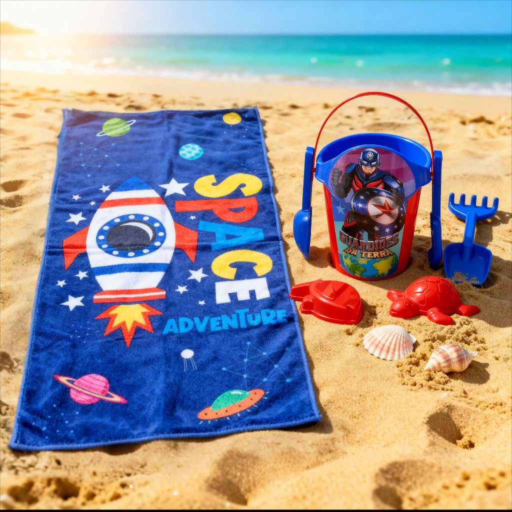 Kit Praia Infantil Balde + Toalha Space | Toalha Space Estampa Modelo Importado | Balde Guardiões KENDY | QUEEN SHOP