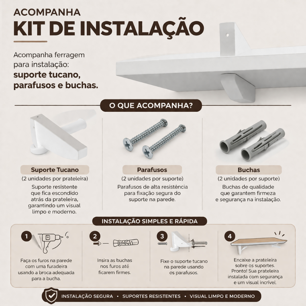 | Kit Prateleiras Branca Com Suporte Tucano Kit Prateleiras Preta Pra... este produto | R$ 21,83 | 23% | 5.0/5 | 19 |