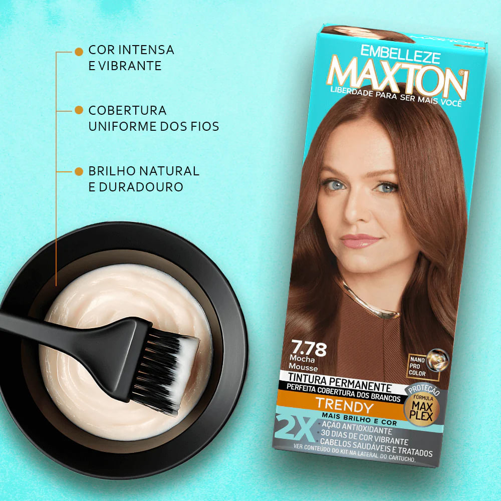 A Maxton Mocha é a escolha perfeita para quem deseja uma cor intensa e cheia de personalidade, sem abrir mão do cuidado com os fios. Sua fórmula exclusiva com tecnologia MaxPlex protege e trata o cabelo durante a coloração, oferecendo mais segurança no processo. Com a inovação Nano Pro Color, os pigmentos se fixam profundamente, garantindo uma cor duradoura e brilho em dobro. E tudo isso com a qualidade profissional que só Maxton oferece, permitindo resultados impressionantes no conforto da sua casa. Benefícios:Protege os fios durante o processo de coloração;Promove cor duradoura e até 2x mais brilho;Ação Antioxidante 30 Dias de cor Vibrante;Qualidade profissional, alcança resultados incríveis em casa;Tecnologia nano pro color, fixa os pigmentos de cor profundamente nos fios. Modo de usar: Veja o Guia Explicativo que foi impresso no interior da embalagem. Com esta atitude simples, a Embelleze reduz o uso de papel e contribui para a preservação da natureza. No Guia, você encontra instruções importantes para obter o melhor resultado com toda a segurança. Sobre a marca: A Embelleze é uma empresa brasileira reconhecida nacional e internacionalmente por transformar a vida das mulheres por meio da beleza. Acreditam na mulher como porta da vida, cheia de sonhos, que traz em seus cabelos sua identidade e sua história a beleza de criar a vida.