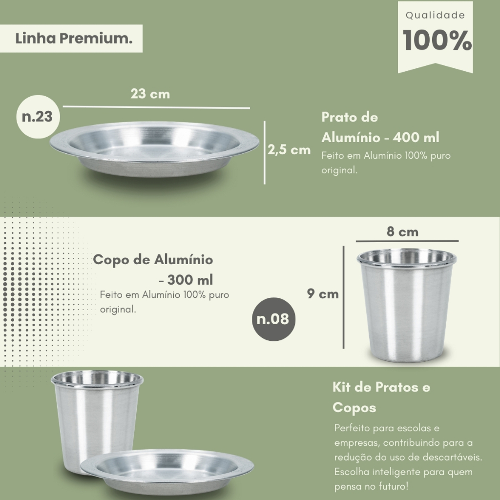 Chegaram os nossos pratos e copos para refeitórios e merenda! Itens perfeitos para crianças, principalmente para o ambiente escolar pois é seguro, não quebra e não enferruja, assim ajudando a evitar bagunça e sujeira! Embora sejam recomendados para crianças nossos pratos e copos podem ser usados por todas as idades devido as suas altas capacidade e tamanhos. Os pratos são fundos e os copos por serem feitos de alumínio deixam as bebidas geladas por muito mais tempo! Ótimo investimento para aqueles que desejam praticidade no dia a dia, complementando as cozinhas domésticas e de bares e restaurantes! Especificações Técnicas: Pratos: Material: Alumínio puro polido Peso: 70 gramas Medidas: Diâmetro de 23 cm (com as bordas) Diâmetro de 18 cm (sem as bordas) Altura: 3 cm Capacidade: 400 ml Copos: Material: Alumínio Puro Polido Peso: 34 gramas Medidas: 8,5 cm de diâmetro, 8,2 cm de altura Capacidade: 300 ml Itens Inclusos: 01 Pratos de Alumínio 400 ml 01 Copos de Alumínio 300 ml Imagens Meramente Ilustrativas