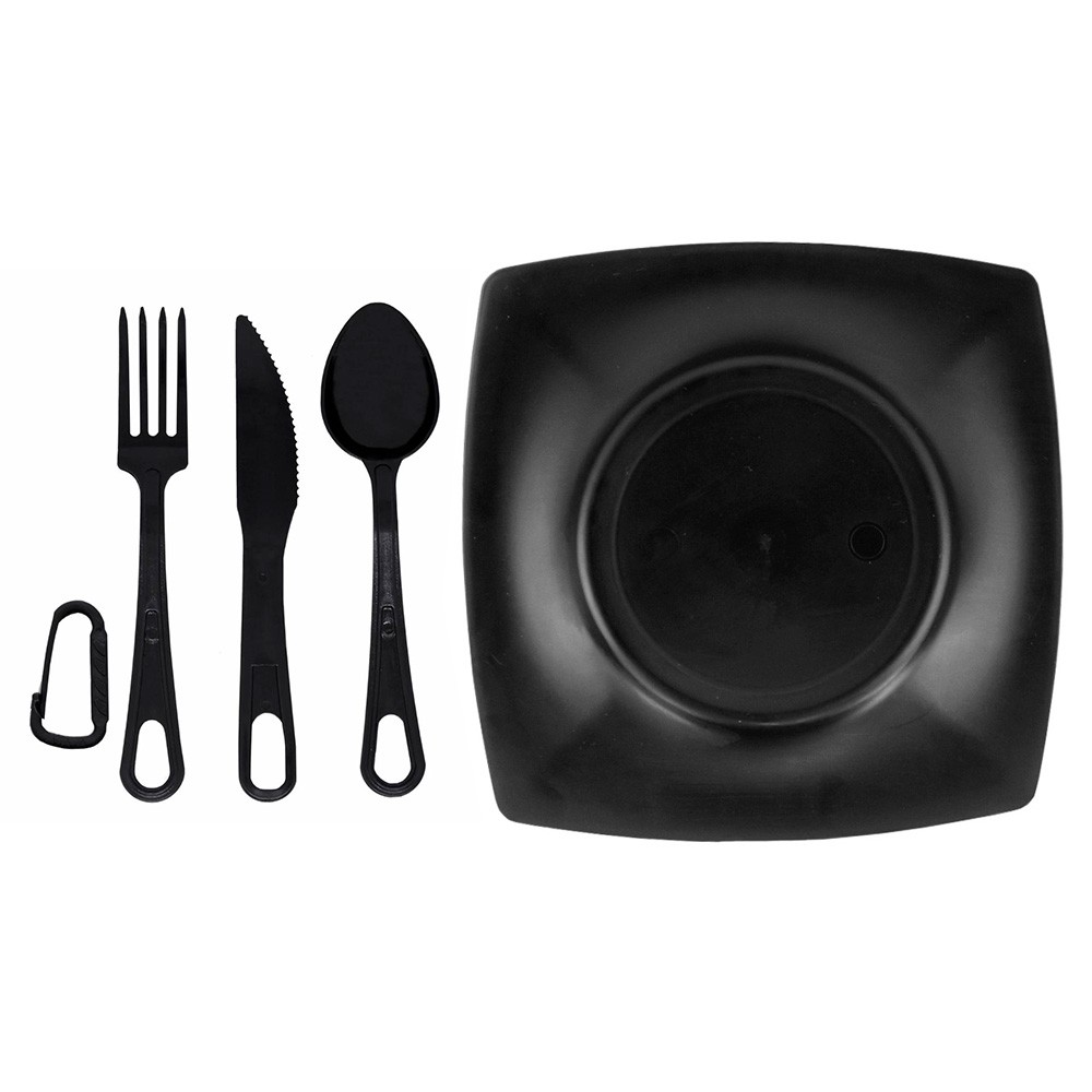Kit Prato Preto Quadrado 22x22cm + Talher de Campanha Colher/Garfo/Faca Preto