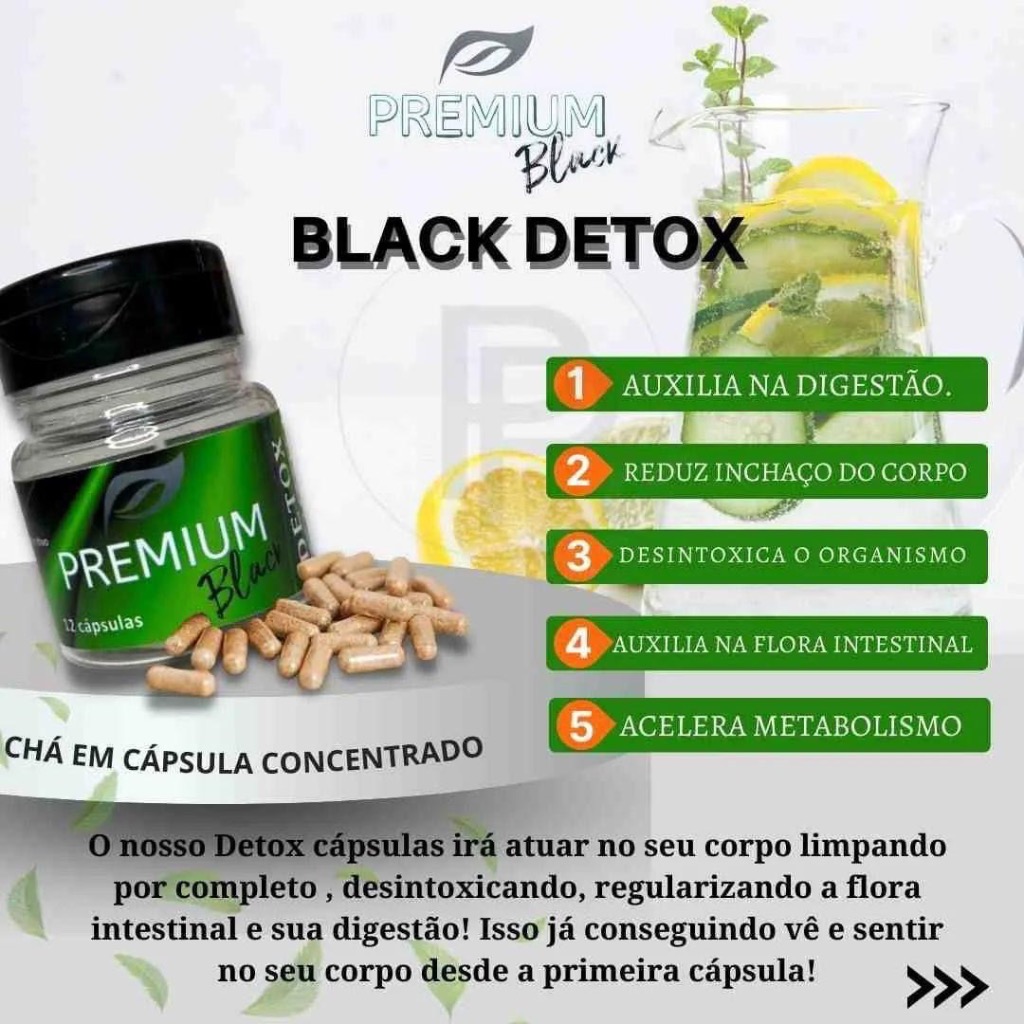 KIT PREMIUM DETOX 01 pote Premium Black (12 cápsulas) 01 pote Premium Black Detox (12 cápsulas) Recomendação de uso: Tomar uma por dia em dias intercalados. Ingerir mínimo de 3litros de água durante o uso dos produtos. Sempre tomar após o café da manhã. Premium black Premium Black é um suplemento alimentar desenvolvido para apoiar um estilo de vida saudável. Sua fórmula conta com ingredientes selecionados, ideal para quem busca praticidade e equilíbrio no dia a dia. Benefícios potenciais: • Pode auxiliar no bem-estar e disposição • Contribui para a rotina saudável quando aliado a alimentação balanceada e exercícios • Praticidade: apenas 1 cápsula por dia Modo de uso: Consumir 1 cápsula ao dia, preferencialmente antes do café da manhã ou conforme orientação de profissional habilitado. Informações complementares: • Conteúdo: 12 cápsulas • Armazenar em local fresco, seco e ao abrigo da luz Importante: Este produto é um suplemento alimentar, não é medicamento. Seu consumo deve estar associado a uma alimentação equilibrada e hábitos de vida saudáveis. Não exceder a recomendação diária de consumo indicada na embalagem. Envio Imediato