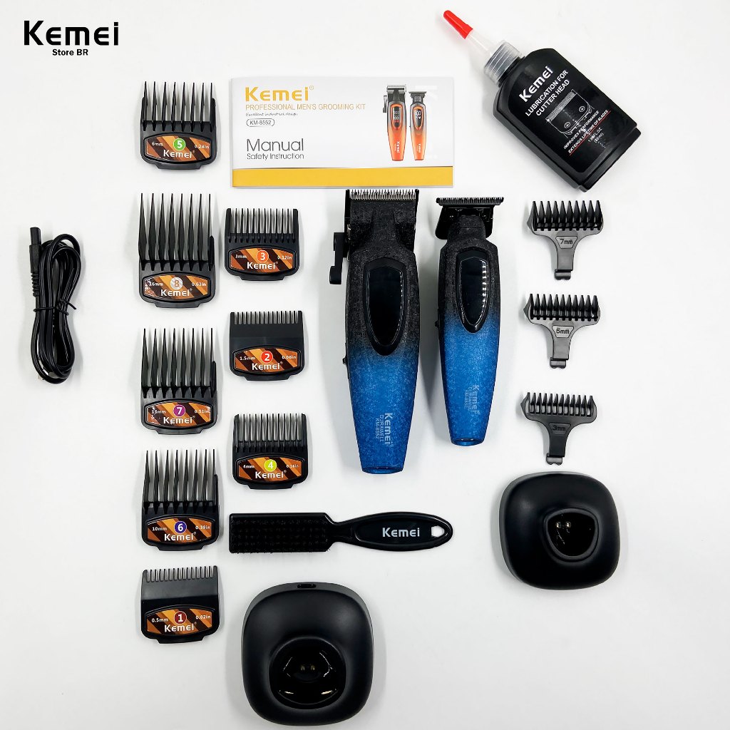 Especificação Modelo: Km-8552 Motor FF 337# 9.000 RPM / FF 280# 8.000 RPM Voltagem: 110-220V 50/60hz (Bivolt) Potência: 5w Bateria de Lítio 2500mAh / 1400mAh Recarga: 3.5h / 2h Uso contínuo: 3h / 2h Visor display LCD Lâminas DLC Itens na caixa 2 * máquinas: Corte + Acabamento 2 * protetores de lâminas 8 * pentes magnéticos corte 0.5, 1.5, 3,4,6,10,13,16mm 3 * pentes acabamento 3, 5, 7mm 2 * base carregadora 1 * cabo carregador usb 1 * pincel de limpeza 1 * manual de instruções