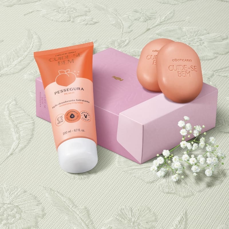 Kit Presente Cuide-se Bem Pessegura (2 itens) o Kit Presente Cuide-se Bem Pessegura vem com dois itens de autocuidado dessa linha queridinha, embalados em uma caixa de presente especial: SABONETE EM BARRA O Sabonete em Barra Cuide-se Bem Pessegura pode ser aplicado no corpo todo e deixa a sua pele limpa, macia e perfumada durante e após o banho. Para garantir um banho eficaz, ele forma espuma cremosa ao entrar em contato com a pele úmida que limpa delicadamente sem ressecar. LOÇÃO CORPORAL A Loção Hidratante Desodorante Corporal Cuide-se Bem Pessegura hidrata e perfuma todo o corpo para uma pele de pêssego. Tem uma textura leve que absorve rapidinho deixando a pele sedosa com toque aveludado. CAIXA PARA PRESENTE A Caixa de Presente O Boticário vem com o tamanho ideal para acomodar os produtos com segurança. Sofisticada e minimalista, as flores estampam a embalagem em 3D , representando o amor abundante que se encaixa em toda a área do presente. Dimensões: 14x5,4x18,6 cm Este Kit contém: 01 Loção Hidratante Desodorante Corporal Cuide-se Bem Pessegura 200ml 02 Sabonete em Barra Cuide-se Bem Pessegura 80g 01 Caixa de Presente O Boticário