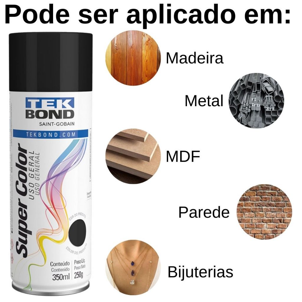 SILCO UTILIDADES KIT SPRAY PRIMER 350ML TEKBOND + SPRAY PRETO FOSCO 350ML + VERNIZ FOSCO 350ML TEKBOND PODE SER UTILIZADO EM: - Cerâmica - Alvenaria - Bijuterias - Madeira - Gesso - Metal - Ferro - MDF Modo de Uso 1. Remova restos de pintura antiga, ferrugem, gordura e poeira. 2. Proteja as partes que não serão pintadas com papel, papelão ou plástico. 3. Para aplicações em metais (ferrosos e não ferrosos) com ou sem oxidação, aplique o Primer Spray Super Color Uso Geral. Espere secar e lixe com lixa d’água 400 para deixar a superfície bem lisa. 4. Agite bem a lata antes do uso e entre as demãos. Se a válvula entupir, retire e mergulhe o bico em thinner ou acetona. Se preciso, desobstrua o orifício com uma agulha. 5. Aplique de 2 a 3 demãos (camadas) para obter uma pintura uniforme e bonita. Na primeira vez, aplique uma fina quantidade de tinta como base para as demais demãos. 6. Entre cada demão, aguarde de 4 a 9 minutos. 7. Para tocar, aguarde 30 minutos. 8. Para manusear a peça, aguarde três horas. 9. O produto leva 24 horas para atingir a máxima resistência. Para testes mecânicos, a recomendação é esperar 72 horas. Rendimento aproximado: 1,7 m2 a 2,1 m2 por embalagem. Não exponha ou armazene este produto em temperatura superior a 50ºC (risco de explosão). Armazenar as embalagens em local bem ventilado, à temperatura ambiente, distante de fontes de ignição. Área coberta, fresca, seca e ventilada. Armazenar a lata em pé. Estocar em temperaturas inferiores a 50°C.