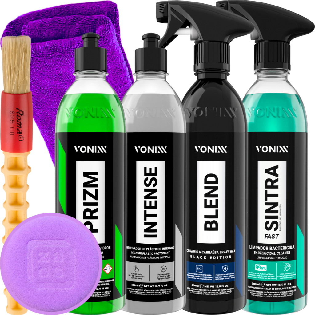 KIT CONTÉM: SINTRA FAST BLEND SPRAY BLACK INTENSE 500ML PRIZM 500ML APLICADOR DE ESPUMA VONIXX PINCEL ROMA PANO 40X40CM ------------------------------------------------------- SINTRA FAST 500ML - LIMPEZA INTERNA DE VEÍCULOS DESCRIÇÃO: Sintra Fast é um multilimpador flotador universal, bactericida e germicida de pH balanceado, indicado para limpeza de painéis, laterais e cantos de portas, bancadas de couro, carpetes e estofados. MODO DE USO: Em painéis, laterais, cantos de portas e bancos de couro: 1. Pulverizar o produto na superfície a ser limpa e desinfetada 2. Utilizar pincel, escova macia ou aplicador de espuma e realizar movimentos circulares até observar o desprendimento total da sujeira 3. Remover o excesso com auxílio de toalha de microfibra úmida. Secar em seguida com uma toalha de microfibra seca ------------------------------------------------------- INTENSE 500ML - RENOVADOR DE PLÁSTICOS INTERNOS DESCRIÇÃO: Intense é um renovador de plásticos com proteção UV, cuja fórmula balanceada promove acabamento natural e toque seco, com durabilidade de 6 meses. MODO DE USO: 1. Certifique-se que a superfície esteja limpa e seca 2. Aplique uma pequena quantidade de produto de maneira uniforme com o auxílio de um aplicador de microfibra 3. Espalhe bem até o total preenchimento da peça ------------------------------------------------------- PRIZM 500ML - RESTAURADOR DE VIDROS DESCRIÇÃO: Prizm restaura a transparência em vidros automotivos e remove marcas de água incrustada, impurezas e contaminantes que não saem com a limpeza convencional. O produto age quimicamente contra as manchas e sujeiras, removendo-as facilmente de para-brisas, vidros laterais e traseiros. PRECAUÇÕES DE USO: - Use luvas de látex nitrílico durante todo o processo aplicação do produto - Não deixe o produto escorrer para a pintura, pois poderá causar manchas irreversíveis - É altamente recomendado realizar teste em uma pequena área dos vidros para verificar o resultado da aplicação antes de começar a usar o produto - Evite que o produto seque sobre a superfície aplicada. Caso aconteça, umedeça a toalha de microfibra novamente e reaplique MODO DE USO: 1. Fazer um teste em uma pequena área para verificar o resultado 2. Aplicar pequena quantidade do produto em toalha de microfibra 3. Esfregar no vidro fazendo movimentos laterais de vai e vem exercendo pressão moderada, em área não superior à 60 x 60 cm por pelo menos 40 segundos, sem deixar o produto secar 4. Caso seque, umedecer a toalha de microfibra novamente e reaplicar. Enxaguar em seguida com água em abundância ------------------------------------------------------- BLEND CERAMIC & CARNAÚBA SPRAY WAX BLACK EDITION - CERA COM SIO2 & CARNAÚBA DESCRIÇÃO: Blend Ceramic & Carnaúba Spray Wax Black Edition é uma cera híbrida, composta por SiO2 e pela mais pura carnaúba tipo 1 que protege a superfície veicular por até quatro meses, em especial as pinturas escuras. O produto promove a resistência cerâmica, brilho quente da carnaúba e hidrorrepelência. DURABILIDADE: Até quatro meses de proteção MODO DE USO: 1. Agitar bem o produto antes de usar 2. Após lavar o veículo, pulverizar uma pequena quantidade do produto na pintura, mantendo distância de 20cm e em área não superior à 60cm x 60cm 3. Sem deixar secar, realizar o acabamento utilizando toalha de microfibra limpa e seca, até obter o brilho desejado 4. Repetir o processo até a conclusão total do veículo. Em caso de manchas, aplicar novamente o produto