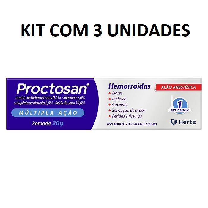 Este é um anúncio da RESILIFARMA, empresa do grupo D&F FARMA que atua há mais de 50 anos no mercado de saúde e beleza. Confira algumas vantagens de comprar na RESILIFARMA: -Temos CNPJ, somos uma empresa consolidada -Emitimos Nota Fiscal Eletrônica -Postamos sua encomenda no mesmo dia ou NO MÁXIMO no próximo dia útil Nossos horários de atendimento: -SEG A SEX das 7h00 às 17h30 LEIA COM ATENÇÃO TODO O ANÚNICIO ANTES DE FINALIZAR A COMPRA! ======================================== Kit Proctosan Múltipla Ação De 1 Aplicadores Com 3 Pomadas De 20g Cada ======================================== Proctosan Múltipla Ação é uma pomada dermatológica anti-hemorroidal de uso tópico. Uso retal externo. Uso adulto. ----------INFORMAÇÕES IMPORTANTES ------------- -Os pedidos serão enviados em até 1 dia útil após APROVADOS pelo Shopee, salvo exceções como instabilidades em sistemas fiscais e logísticos, grande fluxo de pedidos ocasionados por promoções, épocas comemorativas do ano, ou devidos a atrasos ocasionados por empresas terceirizadas (transportadoras, plataformas on-line, fornecedores etc.). Manteremos você informado em qualquer caso de atraso na postagem de sua encomenda.