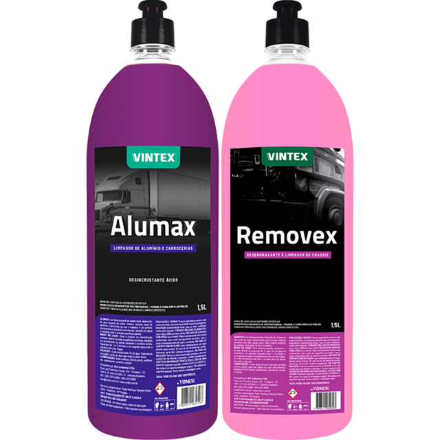 KIT CONTÉM: ALUMAX 1,5L REMOVEX 1,5L ----------------------------------------------------------------- ALUMAX 1,5L DESCRIÇÃO: Alumax é um desincrustante de caráter ácido, desenvolvido para limpeza de rodas, chassis, motores, baús de alumínio, carrocerias de inox e madeira. É um produto concentrado e econômico em seu uso, atuando na sujeira e retirando toda a camada superficial aderida. - Concentrado - Alto Rendimento DILUIÇÃO: 1:10 MODO DE USAR: 1. Diluir o produto na concentração indicada 2. Aplicar em toda a superfície a ser limpa, utilizando um pulverizador ou pistola resistente a produtos ácidos 3. Aguardar de 1 a 2 minutos e em seguida retirar bem o excesso com jato d’água ----------------------------------------------------------------- REMOVEX 1,5L DESCRIÇÃO: Removex é um desengraxante e limpador de chassis de alto poder de ação, desenvolvido para remover sujeiras pesadas como óleo, graxa, barro, lama, matéria orgânica de chassis, carrocerias de ferro e madeira. MODO DE USAR: 1. Para limpeza pesada, pulverizar o produto diluído na proporção de 1L para 10L de água na superfície a ser aplicada 2. Aguardar entre 1 a 3 minutos e em seguida enxaguar completamente com um jato d’água 3. Em caso de limpeza mais leve, o produto deve ser diluído em maior proporção