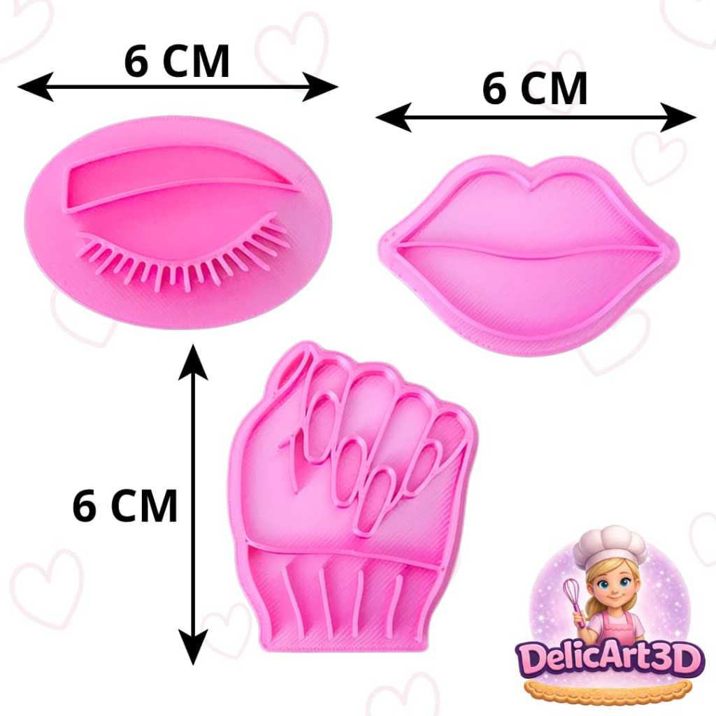 Kit Profissional Beleza Cortador de Biscoito 3D Confeitaria Cílios Boca e Unhas 6 cm