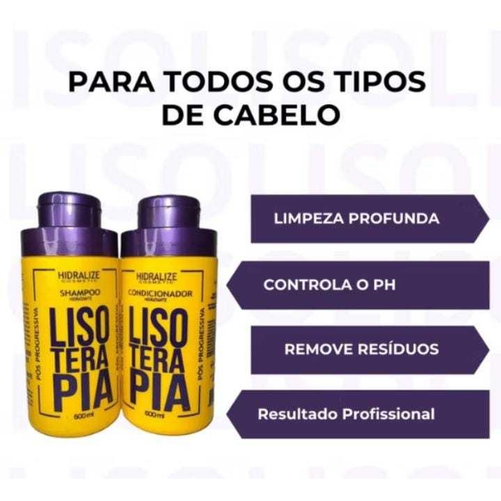 ENVIO EM MENOS DE 24 HORAS Contém: 1 progressiva e 1 kit de Shampoo e Condicionador 500ml,1 mascara Pós Progressiva LISOTERAPIA Sua fórmula inovadora desenvolvida para te dar resultados 7x mais potentes em comparação com a Escova Progressiva, sem formol. Chega de volume ou cabelos danificados - apenas maciez, hidratação e um super brilho. SHAMPOO E CONDICIONADOR PÓS PROGRESSIVA 500 ML CADA Com os cabelos molhados , aplique o shampoo Pós-Química, massageie suavemente até formar espuma, e em seguida enxágue completamente. Após lavar os cabelos com o Shampoo Pós-Química, retire o excesso de água e, em seguida aplique a máscara capilar Pós-química mecha a mecha por todo comprimento dos cabelos. Evite encostar no couro cabeludo. Deixe agir de 5 a 10 minutos e enxágue bem. Depois aplique o condicionador Pós-química nos cabelos por todo o comprimento e principalmente nas pontas. Massageie por toda a extensão e deixe agir por aproximadamente 3 minutos e, em seguida enxágue completamente e finalize como desejar. MÁSCARA RECONSTRUTORA A Mascara de Hidratacao Lisoterapia foi desenvolvida com oleos vegetais de abacate, coco, girasol, argan, Linhaca, macadamia e azeite, responsaveis por oferecer inumeros nutrientes, umectantes e emolientes.