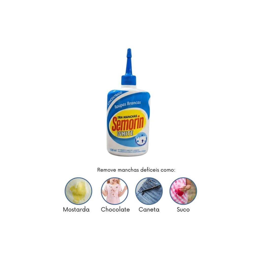 Semorin Maxi 100 ml O tira manchas Maxi foi desenvolvido para quem exige alta performance na remoção de manchas quase impossíveis como bolor/mofo, suor, desodorante etc. Além disso, sua formulação exclusiva ajuda a remover odores impregnados no tecido como por exemplo roupas utilizadas em práticas esportivas/academias. Agregando em sua formulação concentrada ativos específicos para esse desempenho único, o tira manchas Semorin maxi deixa resultados que impressionam. Mantém o exclusivo bico aplicador da versão tradicional, que chega em qualquer cantinho escondido das roupas e evita o desperdício, retirando manchas em apenas uma aplicação! Semorin inova para continuar a merecer a confiança de quem se acostumou com resultados diferenciados na lavagem e remoção de manchas e sujeiras em tecidos. Semorin White 100 ml Com o tira manchas White, Semorin empresta todo seu conhecimento adquirido em anos de especialização na lavagem e remoção de manchas em tecidos para facilitar a vida de quem quer uma remoção perfeita em roupas brancas. Ideal para tirar manchas de roupas, carpetes, tapetes, cortinas, estofados e qualuqer tipo de tecido lavável. Agregando em sua formulação o oxigênio ativo, o branqueador óptico além de uma gama de ativos concentrados Semorin entrega resultados otimizados nos tecidos brancos. O tira manchas Semorin White remove, assim como o produto tradicional, uma infinidade de manchas difíceis tais como: vinho, sucos, frutas, catchup, óleo, sangue, tinta esferográfica, café, chocolate, mostarda, batom, tintura de iodo entre outras de qualquer tecido lavável, deixando resultados nos tecidos brancos que impressionam até os mais exigentes. Mantém o exclusivo bico aplicador da versão tradicional, que chega em qualquer cantinho escondido das roupas e evita o desperdício, retirando manchas em apenas uma aplicação! Modo de uso: Aplique o semorin no tecido ainda seco, diretamente sobre a mancha até que fique bem umedecida Deixe agir entre 5 a 30 minutos, evitando que o produto seque no tecido Esfregue com uma esponja de cerdas macias e proceda com a lavagem normalmente Repita o processo, se necessário. Composição: Tensoativo Aniônico, tensoasivo não iônico, enzimas neutralizante, espessante, dispersante, sequestrante, surfractante, estabilizante, conservante, fragrância e veículo.