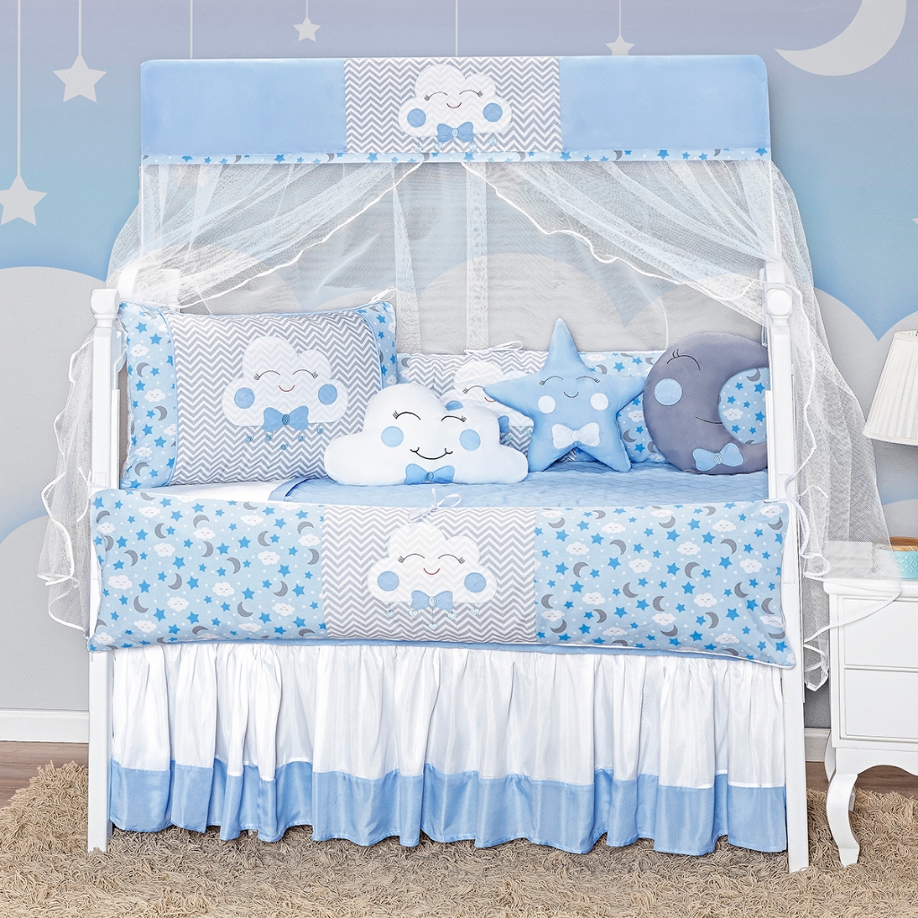 Kit Protetor Berço com Ninho Redutor Bebe Lua Nova Almofadas e Protetores 12 Peças Azul Claro Estrela