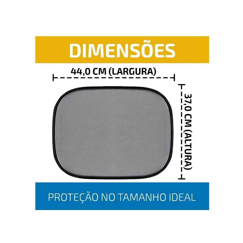 Especificações : Dimensões do Protetor: 0,60 cm(altura) X 1,30 cm(largura) Composição: - Estrutura protetora de Alumínio Polietileno, refletiva e super leve, com acabamento em Viés preto COSTURADO, garantindo assim maior durabilidade do produto. - Elástico para acomodar o Protetor fechado. - Ventosa de Silicone - Super aderente. Conteúdo Da Embalagem : - 01 Protetor Solar Automotivo de Para-Brisas - 02 Ventosas de Silicone -------------------------------------------------------------------------------------- PROTETOR SOLAR / PARA SOL LATERAL DE JANELA Cor disponível: - Preto Fosco Especificações : Dimensões de cada Protetor: 37,0 cm(altura) X 44,0 cm(largura) Composição: - Estrutura de Aço flexível - Tela 100% Poliéster - Ventosa de Silicone Conteúdo Da Embalagem : - 02 Protetores Solares Automotivo de Janela - 04 Ventosas de Silicone