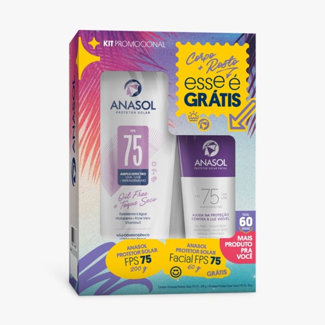 | Kit Protetor Solar Anasol FPS 75 Facial 60g + Corporal FPS 75 200g este produto | R$ 68,97 | 37% | 4.9/5 | 52 |
