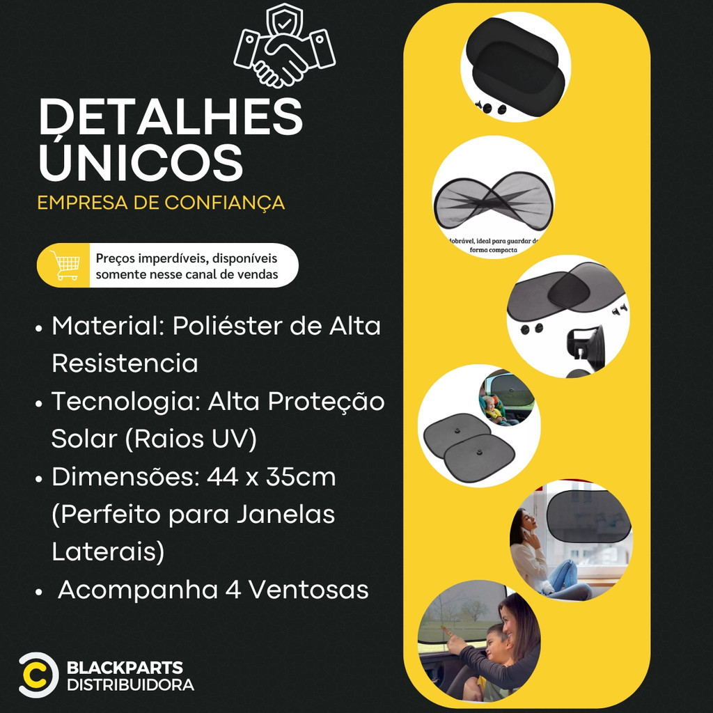 Kit com 2 Protetores Solares para Vidro Lateral – Tela com Ventosas, Dobrável, Universal Mantenha o interior do seu veículo mais fresco e protegido com este kit com 2 protetores solares para carros, ideal para as janelas laterais, mas também compatível com o vidro traseiro ou dianteiro. Produzido em poliéster de alta qualidade, ele bloqueia a entrada direta de luz solar, ajudando a manter a temperatura interna mais agradável e protegendo sua família e o estofado contra os efeitos nocivos do sol. O sistema de fixação com ventosas resistentes permite uma aplicação rápida e segura em qualquer modelo de veículo. Após o uso, o protetor pode ser facilmente removido e dobrado, voltando ao seu tamanho compacto para armazenamento. CARACTERÍSTICAS DO PRODUTO: Tipo: Protetor solar automotivo dobrável Aplicação: Vidros laterais, traseiro ou dianteiro Material: Poliéster leve e resistente Fixação: 2 ventosas por unidade (incluídas) Fácil de aplicar e remover Tamanho compacto quando dobrado Protege contra os raios solares diretos Reduz o calor interno do veículo Preserva o estofado e evita desconforto para os ocupantes ESPECIFICAÇÕES TÉCNICAS: Dimensões (aberto): 44 cm x 36 cm Quantidade: 2 unidades (1 para cada janela) Cor: Preta (translúcida) ITENS INCLUSOS: 2 Protetores solares dobráveis 4 Ventosas para fixação