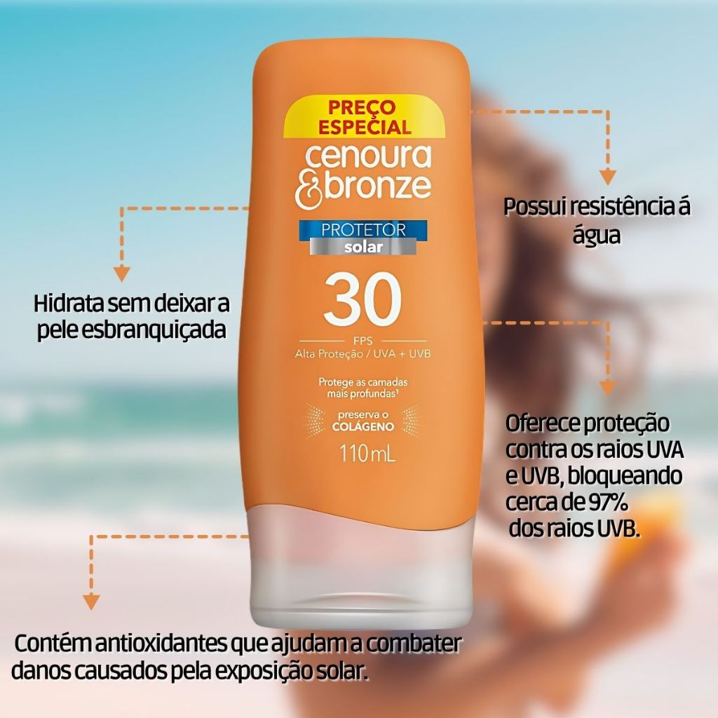 Envio Imediato! O kit contem: 2 Protetor solar 110ml O Cenoura & Bronze FPS 30 é um protetor solar desenvolvido para oferecer proteção eficaz contra os raios UVA e UVB, prevenindo queimaduras, manchas e o envelhecimento precoce da pele. Sua fórmula foi pensada para garantir alta performance, rápida absorção e conforto durante o uso, seja no dia a dia ou em atividades ao ar livre. Benefícios: Proteção FPS 30: Protege contra os raios UVB, responsáveis pelas queimaduras solares, e oferece proteção UVA, que previne o envelhecimento precoce e danos profundos na pele. Ação Antienvelhecimento: Auxilia na prevenção de rugas, linhas de expressão e manchas, causadas pela exposição diária ao sol. Resistente à Água e ao Suor: Ideal para praia, piscina e práticas esportivas ao ar livre, mantendo a proteção mesmo em ambientes úmidos. Fórmula Hidratante: Contém agentes que ajudam a manter a pele macia e hidratada durante o uso, evitando o ressecamento. Textura Leve e Não Oleosa: Absorve rapidamente, não deixa a pele pegajosa e proporciona toque seco confortável. Ajuda a Intensificar o Bronzeado: Mantém o bronzeado bonito e saudável por mais tempo, sem abrir mão da proteção necessária. Dermatologicamente Testado: Seguro para uso diário, minimiza riscos de alergias e irritações. Modo de Uso Aplique o protetor solar generosamente sobre a pele seca, cerca de 15 a 20 minutos antes da exposição ao sol. Reaplique sempre após suar excessivamente, entrar na água, se enxugar com toalha ou a cada 2 horas para garantir a proteção contínua. Não se esqueça de aplicar nas áreas mais expostas, como: rosto, orelhas, pescoço, ombros, braços e pernas. Para uso no rosto, aplique delicadamente em movimentos circulares até completa absorção.