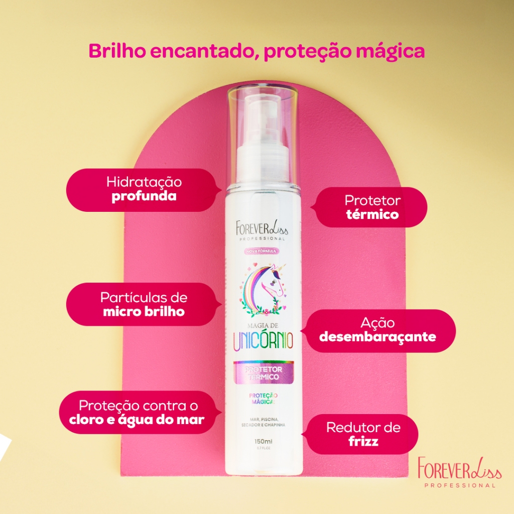 O Protetor Térmico Magia de Unicórnio é a solução perfeita para quem busca proteção e hidratação profunda para os cabelos, oferecendo uma barreira eficaz contra os danos causados por fatores externos como o mar, piscina, poluição e o calor excessivo. Este tratamento inovador forma uma camada protetora nos fios, evitando que a agressão de agentes externos prejudique a saúde do cabelo, enquanto promove uma hidratação intensa, deixando os fios mais suaves, sedosos e com brilho radiante. O Spray Bye Bye Volume e No Frizz Liso Mágico 200ml é um spray alinhador dos fios que conta com proteção térmica. É ideal para a finalização de cabelos com excesso de volume e incômodo de frizz, já que forma uma película protetora contra a umidade. Seu uso previne pontas duplas, nutre, hidrata e proporciona brilho intenso. Conta com nanotecnologia aliada a ingredientes nobres tais como semente de linhaça. Modo de uso: Spray Bye Bye Volume 01. Após lavar e condicionar os cabelos, retire a umidade com uma toalha; 02. Borrife o SPRAY BYE BYE VOLUME E NO FRIZZ diretamente nos cabelos úmidos ou secos; 03. Não necessita de enxágue; 04. Finalize com secador. Spray Magia De Unicórnio Aplique antes e após entrar no mar ou piscina para proteger os fios. Também pode ser usado após o banho, como finalizador, sobre os cabelos limpos e condicionados, para garantir hidratação, brilho e proteção térmica. Contém: 01 - Protetor Térmico Magia de Unicórnio Forever Liss 150ml 01 - Spray Bye Bye Volume E no Frizz Forever Liss 200ml GANHE Escova Desembaraçadora Forever Liss