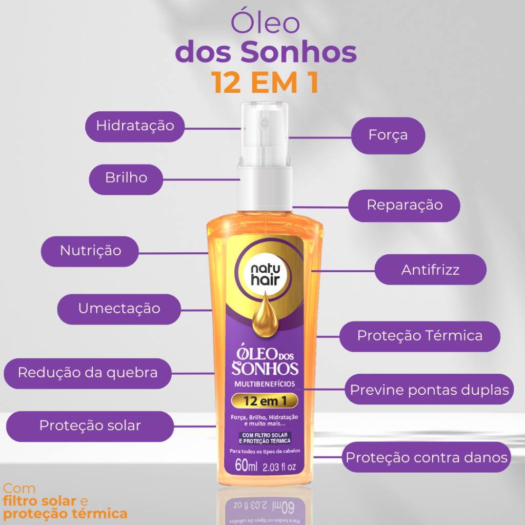 Kit Completo: Protetor Térmico + Óleo dos Sonhos 12 em 1 + Super Óleos + Terapia Capilar + Óleo dos Sonhos Cachos Natuhair 60 ml Este kit reúne 5 produtos essenciais da linha Óleo dos Sonhos e TratMais, para cuidado total dos cabelos: Protetor Térmico Natuhair TratMais: fórmula com óleo de coco, D‑Pantenol e proteína do trigo, protege a fibra dos fios contra altas temperaturas, reduz o frizz e proporciona brilho intenso. Também contém filtro solar para proteger do calor e da exposição piscinal ou solar. Óleo dos Sonhos 12 em 1: óleo multifuncional que oferece 12 benefícios — hidratação, força, nutrição, brilho, proteção térmica, solar, anti‑frizz, reparação, controle da queda, prevenção de pontas duplas, entre outros — tudo em um só frasco. Óleo dos Sonhos Super Óleos: blend com óleo de coco, macadâmia e rosa mosqueta, promove brilho radiante, nutrição intensa, hidratação profunda, reparação, controle de frizz e proteção térmica/solar. Óleo dos Sonhos Terapia Capilar: formulado com óleo de coco, rícino e alecrim, fortalece, hidrata profundamente, repara e oferece proteção térmica e solar. Óleo dos Sonhos Cachos: formulado com óleo de argan, coco e abacate, devolve definição impecável, hidratação intensa e controle absoluto do frizz nos cabelos cacheados. Também possui filtro solar e proteção térmica. Modo de usar: Aplique algumas gotas de qualquer um dos óleos (Terapia, Super Óleos, Óleo dos Sonhos Cachos ou 12 em 1) na palma das mãos. Distribua ao longo do comprimento e nas pontas do cabelo úmido ou seco. Use também como pré‑shampoo ou styling finalizador — não é necessário enxaguar. O Protetor Térmico deve ser aplicado nos cabelos úmidos antes do secador, chapinha ou babyliss; também pode ser usado como finalizador no cabelo seco. Use os produtos conforme a necessidade dos fios para conquistar cabelo nutrido, protegido, definido e com brilho. Precauções; Este kit é para uso exclusivamente externo. Mantenha os produtos fora do alcance de crianças. Evite contato com os olhos; se ocorrer, enxágue com água em abundância. Não aplique sobre o couro cabeludo irritado ou lesionado. Caso ocorra qualquer sinal de irritação, suspenda o uso e procure orientação médica. Conserve em local fresco, seco e protegido da luz. Não ingerir.
