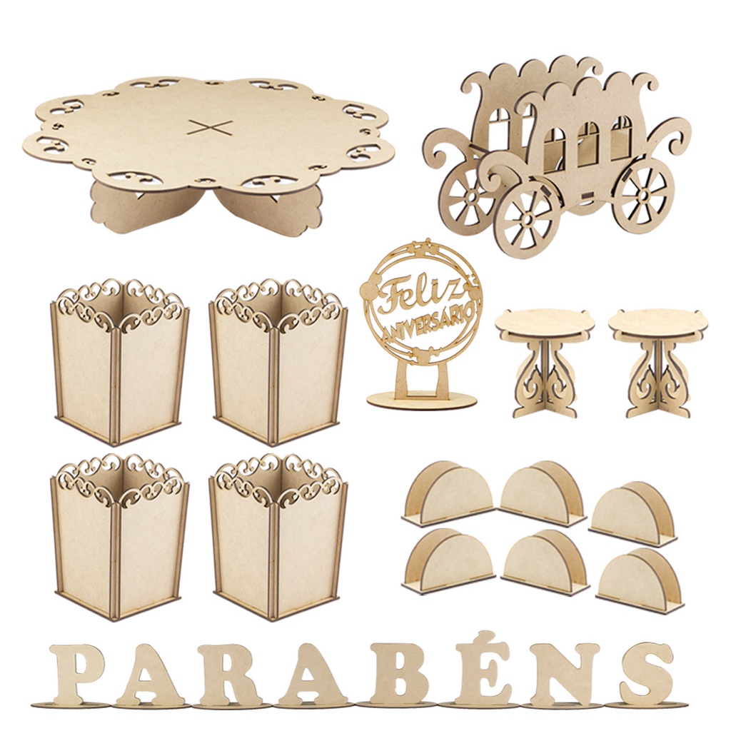 ############## PROMOÇÃO ################## SÓ HOJE A OPORTUNIDADE DE COMPRAR BARATO FESTA PROVENÇAL PRODUTOS INCLUSOS NO KIT: Trio de bandejas - 03 peças Bandeja G - Largura 26,9cm x comprimento 26,9cm x altura 4,3cm x espessura mdf 3mm Bandeja M - Largura 22cm x comprimento 22cm x altura 4,3 cm x espessura mdf 3mm Bandeja P - Largura 16cm x comprimento 16cm x altura 4,3cm x espessura mdf 3mm Árvore - Considerado 03 peças pelas bandejas Árvore Montada - Largura 40cm x altura 34cm x espessura mdf 3mm 3 Bandejas P - Largura 15cm x comprimento 15cm x altura 4,3cm x espessura mdf 3mm Trio Baleiro - Considerado 03 peças pelas bandejas Trio Baleiro Montado - altura 34,3cm x espessura mdf 3mm Bandeja G - Largura 26,9cm x comprimento 26,9cm x altura 4,3cm x espessura mdf 3mm Bandeja M - Largura 22cm x comprimento 22cm x altura 4,3 cm x espessura mdf 3mm Bandeja P - Largura 16cm x comprimento 16cm x altura 4,3cm x espessura mdf 3mm Porta Bolo - 01 peça Porto Bolo - Largura 37cm x comprimento 37cm x altura 8cm x espessura mdf 3mm Porta Tubetes - 01 peça Largura 26,9cm x comprimento 26,9cm x altura 4,3cm x espessura mdf 3mm Cachepot P - 04 peças Cachepot - Largura 11cm x comprimento 11cm x altura 13,5cm x espessura mdf 3mm Piruliteiro - 01 peça Piruliteiro – profundidade 22,5cm x comprimento 21,2cm x altura 31cm x espessura mdf 3mm Cachepot Carruagem - 01 peça Carruagem – profundidade 6,6cm x comprimento 18,2cm x altura 12cm x espessura mdf 3mm Parabéns - Considerado 08 peças Cada Letra - 09cm de altura x espessura 3mm Porta Guardanapos - 6 peças Porta Guardanapos - comprimento 9,4cm x altura 5,3cm x espessura 3mm Mesinha – comprimento 10,1cm x largura 10,1 x altura 8cm Topo de Bolo – comprimento 14,3cm x altura 19,4cm x 3mm espessura Para Diminuir os valores do frete, os produtos são enviados desmontados, A montagem é simples, só encaixar as peças e colar com cola branca para fixar, No anuncio tem um vídeo explicando como montar.