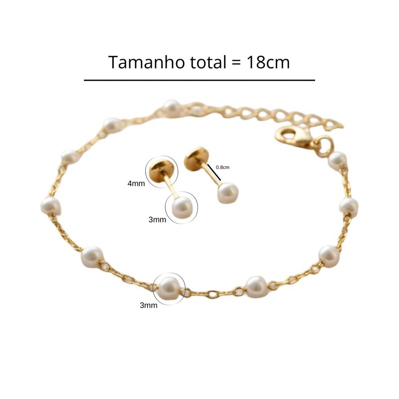 kit pulseira+Brinco de pérolas infantil recém-nascido 3mm Banhado a ouro 18k + Saquinho de Veludo.