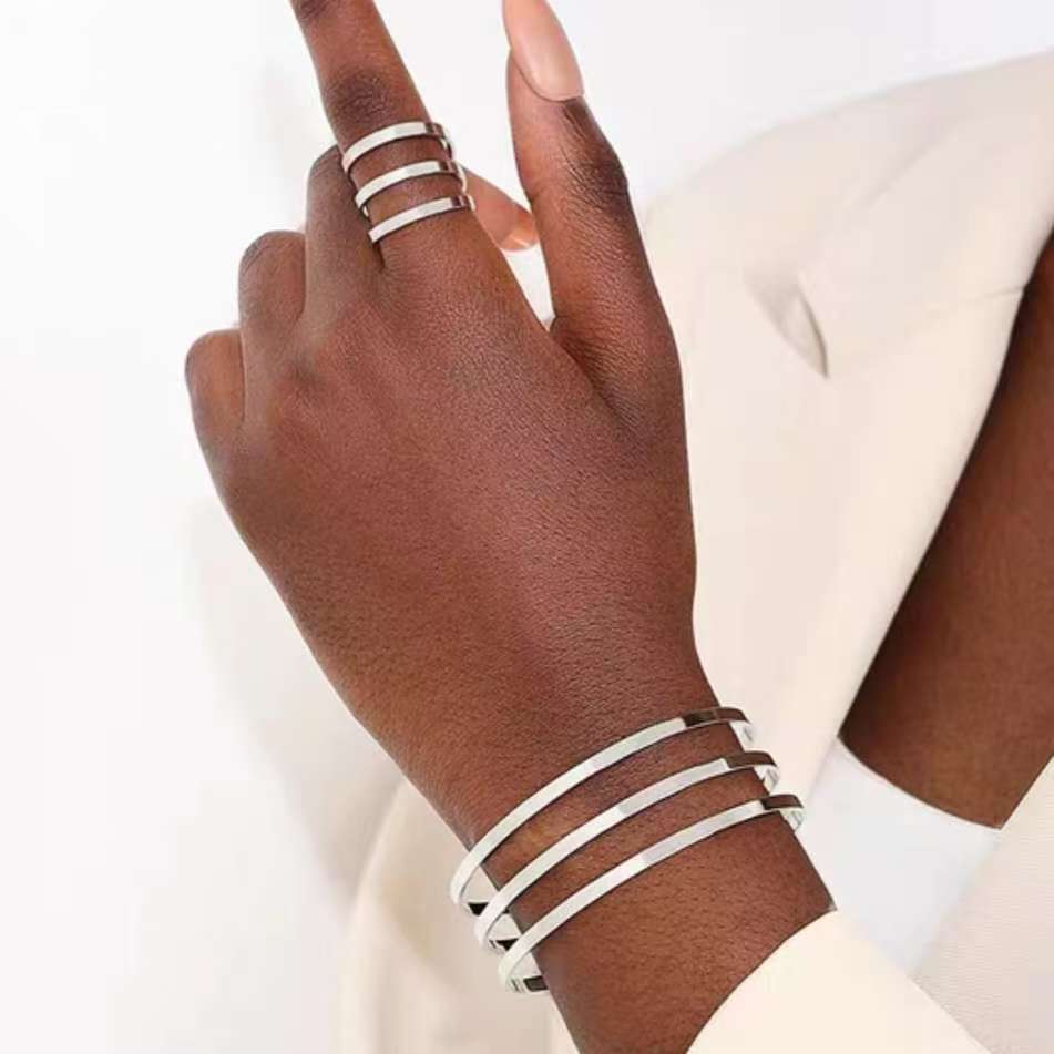 Kit Pulseira e Anel Prata 925, Design Multicamadas Aberto e Mínimo - Conjunto Exclusivo