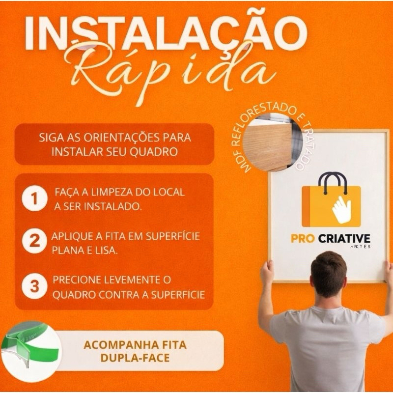 Transforme seu ambiente com nossos incríveis quadros decorativos em MDF 3MM! Adicione estilo e personalidade aos seus ambientes com essa coleção única de arte. Informações Técnicas: - O quadro NÃO possui moldura, pronto para pendurar na parede. - São feitos em adesivos ‘’vinil’' de alta qualidade em impressão. - Não é necessário furar a parede para instalação, pois, enviamos fitas com grande poder adesivo para melhor instalação. - É necessário na hora da instalação posicionar o quadro em 01 cm de largura entre eles para melhor qualidade de visualização. - Limpeza: Utilizar Pano Seco ou espanador. - Utilizar em ambientes internos. - Não exponha o produto em paredes com sinais de umidade ou sob luz direta do sol, pois estes são prejudiciais a longevidade do mesmo. - Não coloque peso sobre o produto ou empilhe, isto poderá deformar sua tela. Confira agora mesmo em nossa loja! 🏠✨ QUALQUER DÚVIDA SOBRE O PRODUTO CONTATE NOSSA EQUIPE, IREMOS ATENDÊ-LOS DA MELHOR MANEIRA POSSÍVEL E TIRAREMOS TODAS SUAS DÚVIDAS !!