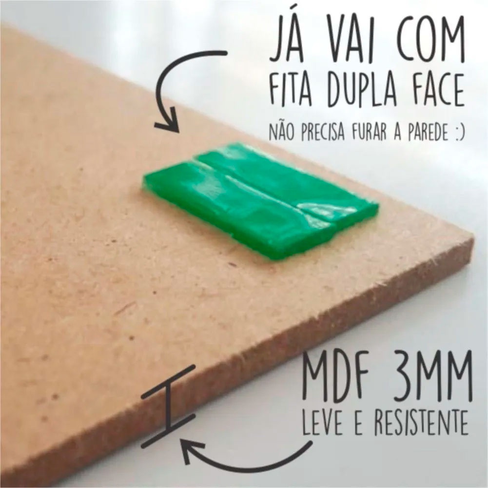 Nossas placas decorativas são tendência e uma excelente ideia para decorar ambientes de forma econômica e bonita, elas são leves e extremamente fáceis de instalar; além de servir para a decoração de qualquer ambiente, indo desde estabelecimentos como quartos, sala, área de lazer, churrasqueira, até mesmo barbearias e bares etc. Ou ainda, e por que não, poder quebrar aquele galho tampando imperfeições indesejadas da parede com um toque especial Material: MDF 3mm, ótima qualidade ! Adesivo vinil de alta qualidade Especificações - Moldura : Sem moldura - Medida dos quadros : 3 Peças 20x30 - Profundidade de 3 mm (Espessura da placa MDF) - Não Acompanha Vidro Atenção: A moldura não é de madeira. Moldura já impressa no próprio adesivo dano assim um visual mais perfeito. Instalação: A instalação é muito simples, os quadros já vem com uma fita dupla face para que você possa o instalar em qualquer superficie desejada. Limpeza: Utilize um pano úmido com apenas água para garantir maior durabilidade do produto. Impressão e acabamento: Nossos quadros são impressos em Vinil Branco Fosco de alta qualidade, utilizamos MDF com espessura de 3mm, para que tenha um produto de alta qualidade e resistente.