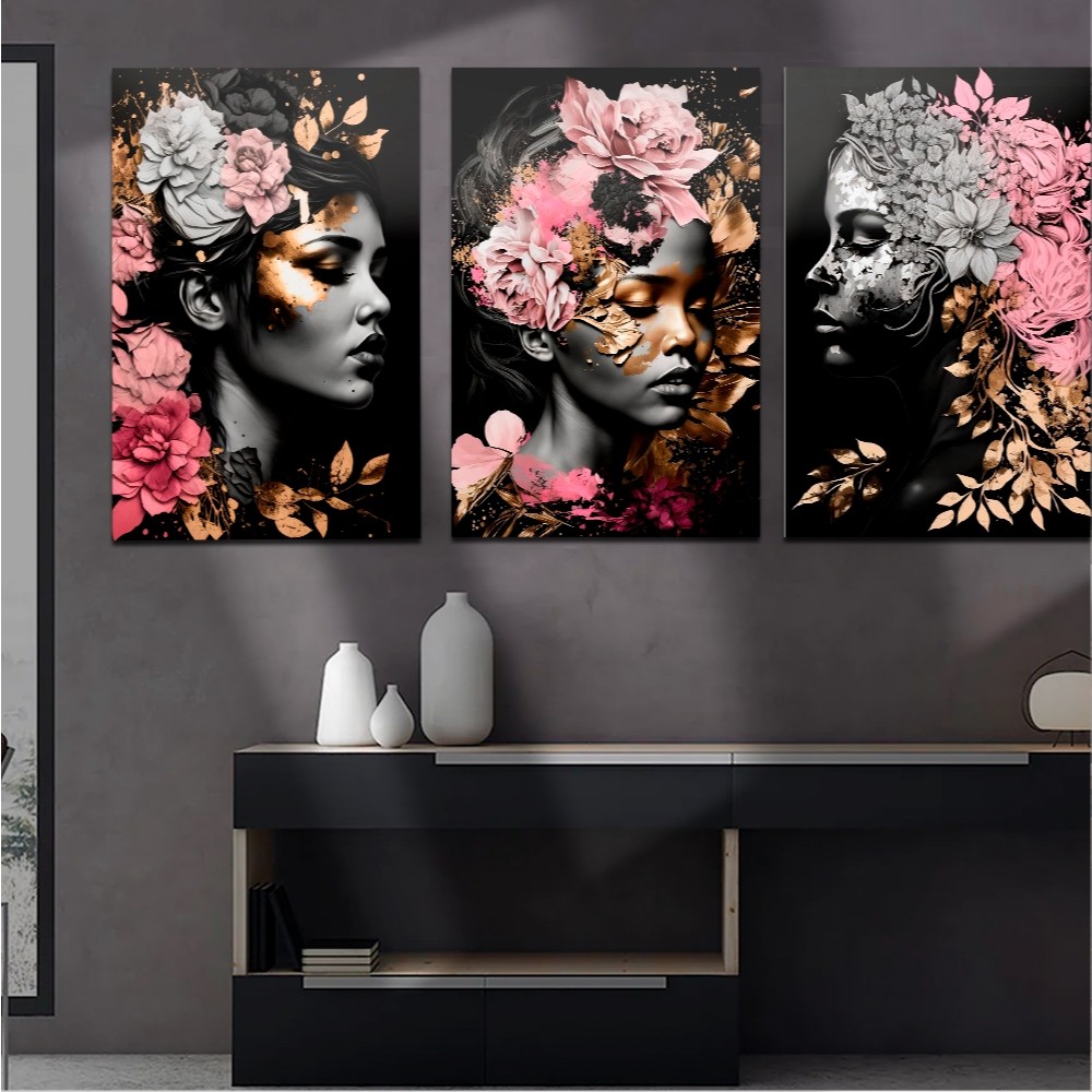 Kit quadros decorativos 3 peças salão de beleza mulheres flores rosa luxo fundo preto