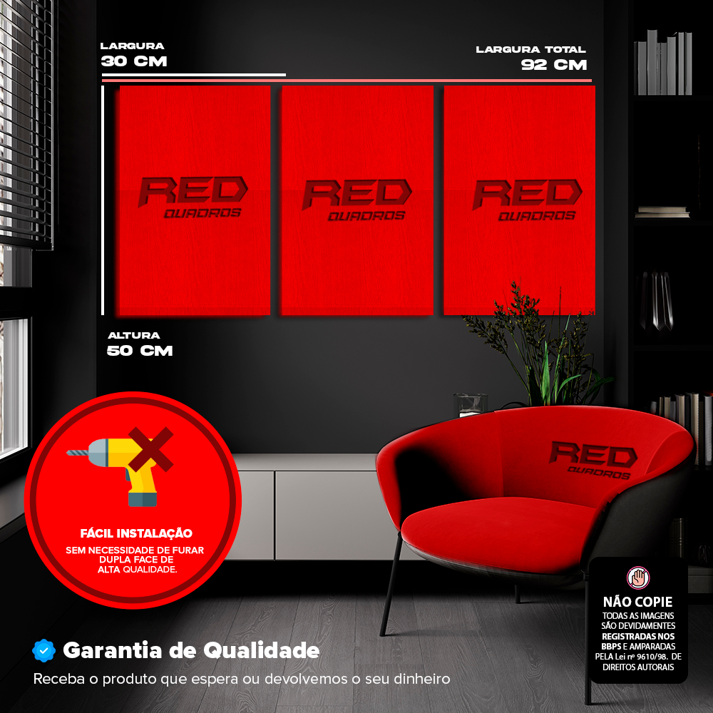RED QUADROS ´´´´Tela em Chassi De Madeira MDF (reflorestada, tratada e imunizada) Informações Técnicas: - O Quadro De Parede pronto para pendurar na parede. - São feitos em adesivos ‘’vinil’' de alta qualidade em impressão. - Não é necessário furar a parede para instalação, pois, enviamos fitas com grande poder adesivo para melhor instalação. - É necessário na hora da instalação posicionar o Quadro De Parede em 01 cm de largura entre eles para melhor qualidade de visualização. Trabalhamos com as seguintes medidas.. 3 PEÇAS 20X30 TOTAL 63X30 3 PEÇAS 30X50 TOTAL 93X50 3 PEÇAS 40X60 TOTAL 123X60 Especificações Técnicas - Kit Contendo 3 Peças { COM ESPAÇAMENTO ENTRE AS PEÇAS DE 1cm: Cuidados: - Limpeza: Utilizar Pano Seco ou espanador. - Utilizar em ambientes internos. - Não exponha o produto em Parede com sinais de umidade ou sob luz direta do sol, pois estes são prejudiciais a longevidade do mesmo. - Não coloque peso sobre o produto ou empilhe, isto poderá deformar sua tela. QUALQUER DÚVIDA SOBRE O PRODUTO CONTATE NOSSA EQUIPE, IREMOS ATENDE-LOS DA MELHOR MANEIRA POSSIVEL E TIRAREMOS TODAS SUAS DUVIDAS !! Garantia do vendedor: 3 meses