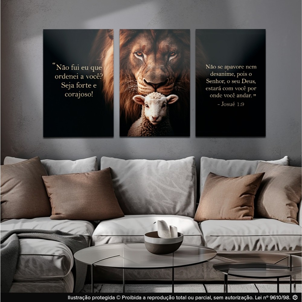 kit quadros decorativos leão de juda e ovelha frase motivacional Senhor Deus religião 3 peças