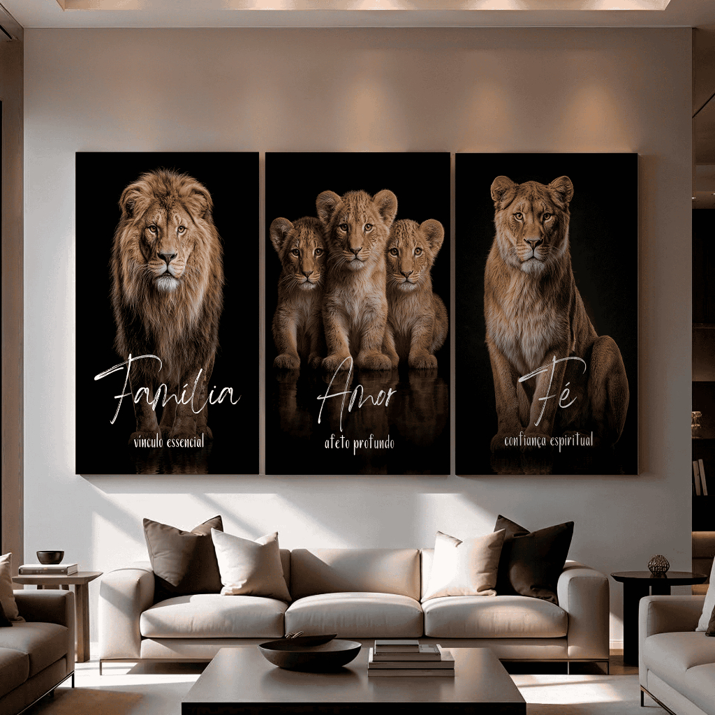 Kit Quadros Decorativos Leão Leoa 3 Filhotes Familia Rei Rainha Fé Amor Sala Quarto Hall