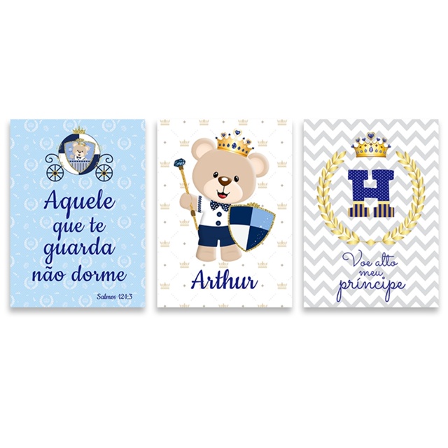 Kit Quadros Decorativos Ursinho Realeza Quarto de Bebê com Nome Personalizado Infantil 3 peças PQF0-09