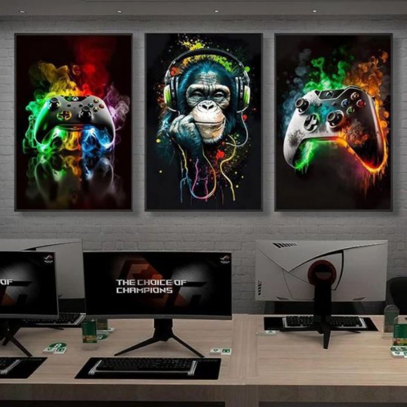Kit Quadros Gamer 3 peças macacos colors decoração sala quarto quadros Full HD Playstation controle