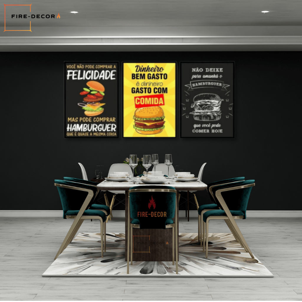 Kit Quadros Para Lanchonete Hambúrguer Frase 4K Decoração Lanche 3 Peças