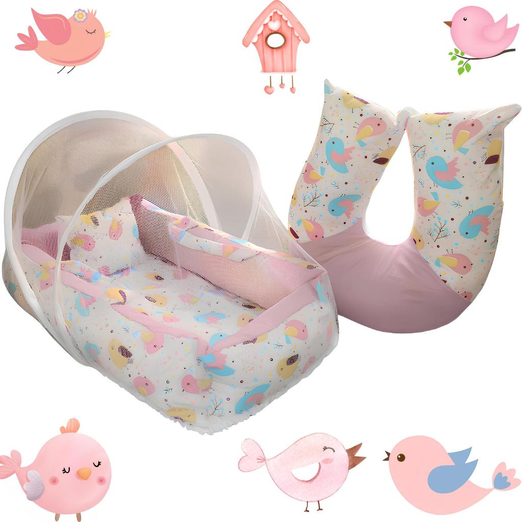 Kit Quarto Ninho Redutor Rosa Passarinho Com Almofada Amamentação e mosquiteiro