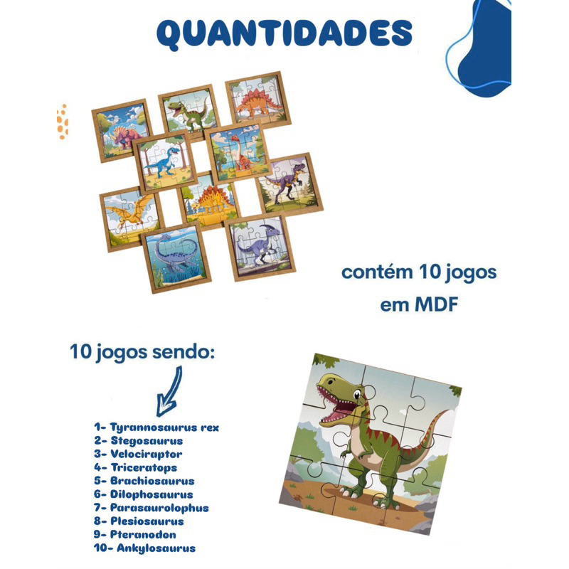 Kit Quebra Cabeça Dinossauros Para Crianças Brinquedo em MDF Contendo 9 Peças Jogo Pedagógico Infantil