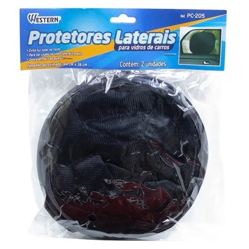 JOGO 2 PROTETORES SOLARES DE AUTOMÓVEL PARA VIDRO LATERAL 44 X 36CM: Proteja sua família dos raios de sol enquanto ele estiver no carro com nosso protetor solar para lateral de carro, deixando a viagem muito mais tranquila. Deve ser usado no vidro lateral traseiro, um protetor dobrável, fácil de guardar e evitando a luz solar no rosto. - Dimensões da Peça: • Protetor: 44 x 36 x 0,2cm • 4 Ventosas: 4 x 4 x 1,8cm - Dimensões da Embalagem: 20 x 2,5 x 23cm - Material: Nylon e Aço Carbono - Cor: Preto - Marca: Western - Contém: 2 unidades. - Cuidados: • Mantenha o protetor solar longe de áreas ou objetos quentes. • Quando o veículo estiver em movimento, este produto somente pode ser utilizado no vidro lateral traseiro. • Guarde estas instruções para futuras consultas. • Manter fora do alcance das crianças. - Garantia: • Em condições normais de uso, este produto tem garantia de 90 dias contra defeitos de material e fabricação, mediante apresentação da nota fiscal de compra. Má conservação, manuseio inadequado, quedas ou quaisquer outras avarias produzidas pelo uso incorreto, a garantia oferecida perde a validade.