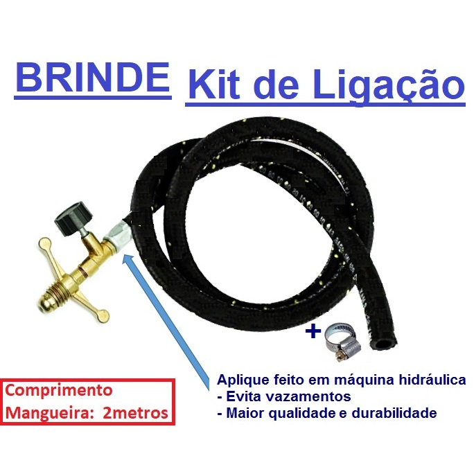 Seja bem vindo!! Queimador de alta pressão com 5 caulins + Kit com mangueira e registro para instalação no botijão 13 KG Mangueira com 2 metros de comprimento!! QUEIMADOR: - Corpo em aço carbono, tampa em aço inox e registro em zamac; - Modelo de alta pressão, produz uma chama bem forte, muito usado para frituras e fervuras diversas; - Com parafuso inferior para fixação; - Excelente para ser adaptado em fogões diversos como pasteleiros e fritadeiras a gás. Medidas do Queimador: - Comprimento do cano do gás: 18cm; - Diâmetro do queimador: 11,5cm; - Altura: 4cm; Inclui: - Queimador 5 caulins, - Kit com 2m mangueira e registro P13 - 1 metro e 01 abraçadeira de conexão com o registro do queimador, SKU 32C