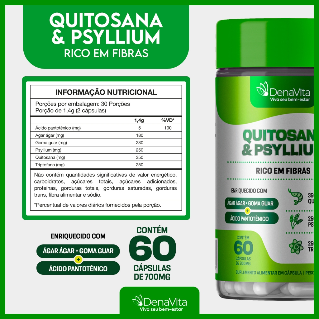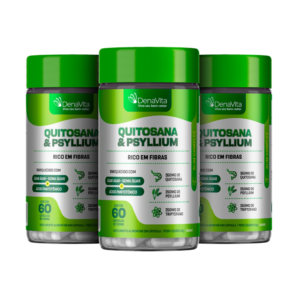 QUITOSANA + PSYLLIUM + TRIPTOFANO | MIX DE FIBRAS INTELIGENTES | DENAVITA ✨ Dica de Ouro Denavita: Para que as fibras do Psyllium e da Quitosana funcionem perfeitamente, a hidratação é a chave! Ao consumir suas cápsulas, beba pelo menos um copo grande de água (250ml) e mantenha o corpo hidratado ao longo do dia. Isso garante que as fibras cumpram seu papel de gerar conforto e saciedade na sua rotina! 🟢 Descrição do produto A Denavita é uma marca brasileira focada em bem-estar, rotina saudável e cuidado diário, com um portfólio completo de suplementos alimentares desenvolvidos para facilitar o consumo e acompanhar diferentes estilos de vida. O suplemento de Quitosana com Psyllium da Denavita foi desenvolvido para ser um suporte estratégico na sua jornada de autocuidado. Combinando fibras naturais e aminoácidos, ele é o aliado ideal para quem busca manter o equilíbrio nas refeições e uma rotina alimentar mais consciente. 🔬 O que é o Quitosana Mix? É uma combinação inteligente de fibras solúveis e insolúveis (Psyllium, Quitosana, Goma Guar e Ágar-ágar) enriquecida com L-Triptofano. Essa fórmula age em conjunto para promover uma sensação de preenchimento e suporte ao metabolismo energético, ajudando você a manter o foco nos seus objetivos de vida saudável. ✅ Destaques do produto: Mix de 4 Fibras: Quitosana, Psyllium, Goma Guar e Ágar-ágar para suporte completo. Com L-Triptofano: Auxilia na produção de serotonina, promovendo bem-estar emocional. Vitamina B5: Contribui para o metabolismo energético diário. Apoio à Rotina: Ideal para ser consumido antes das principais refeições. Qualidade Denavita: Ingredientes selecionados para máxima eficácia e segurança. 🥄 Como consumir: Ingerir as cápsulas com pelo menos 200ml de água, preferencialmente 30 minutos antes do almoço e do jantar, ou conforme orientação de um profissional de saúde. 📊 Composição em Destaque: Fibras Naturais (Absorção e Saciedade) L-Triptofano (Equilíbrio e Bem-Estar) Ácido Pantotênico (Energia) ⚠️ Advertências: Este produto não é um medicamento. Não exceder a recomendação diária indicada na embalagem. ALÉRGICOS: CONTÉM DERIVADOS DE CRUSTÁCEOS. Mantenha fora do alcance de crianças. Produto isento de registro conforme RDC 240/18 e RDC 843/2024 (ANVISA).