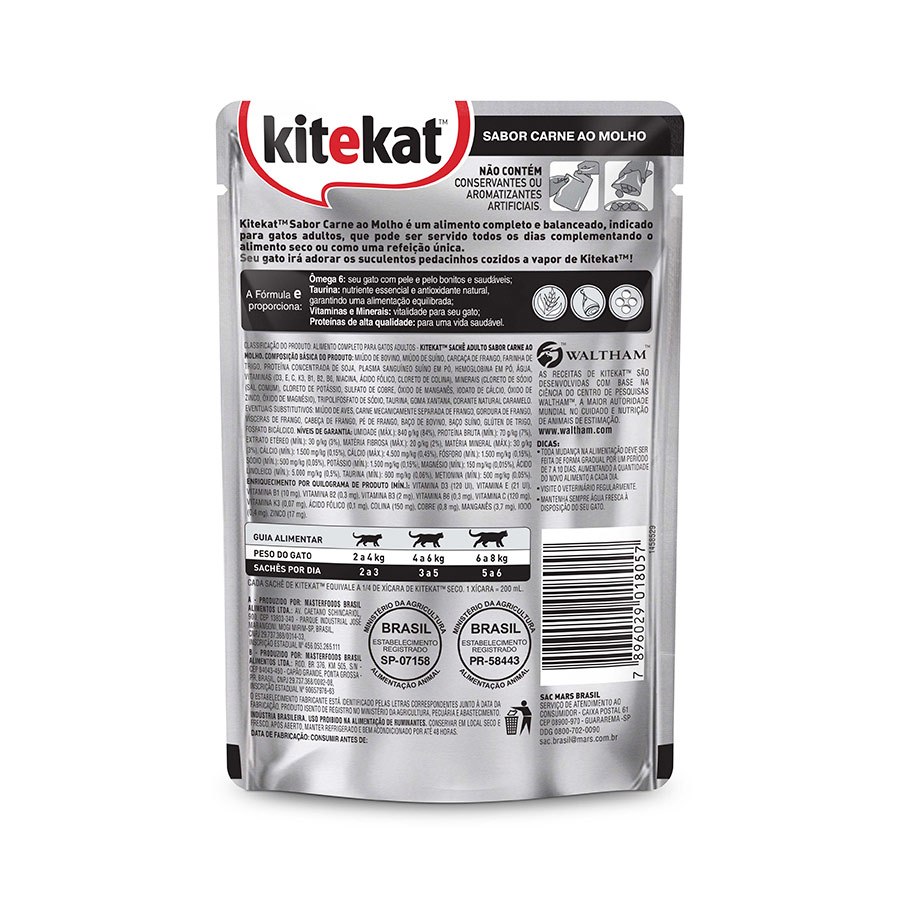 | Kit Ração Kitekat Úmida Sachê Carne ao Molho para Gatos Adultos 24 ... este produto | R$ 62,99 | 23% | 5.0/5 | 1 |